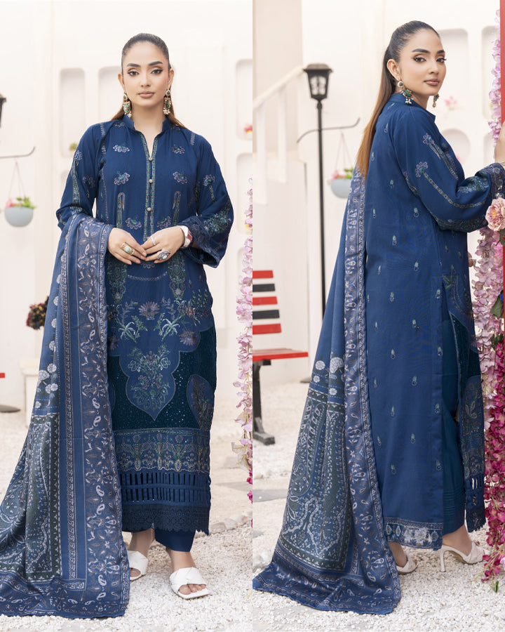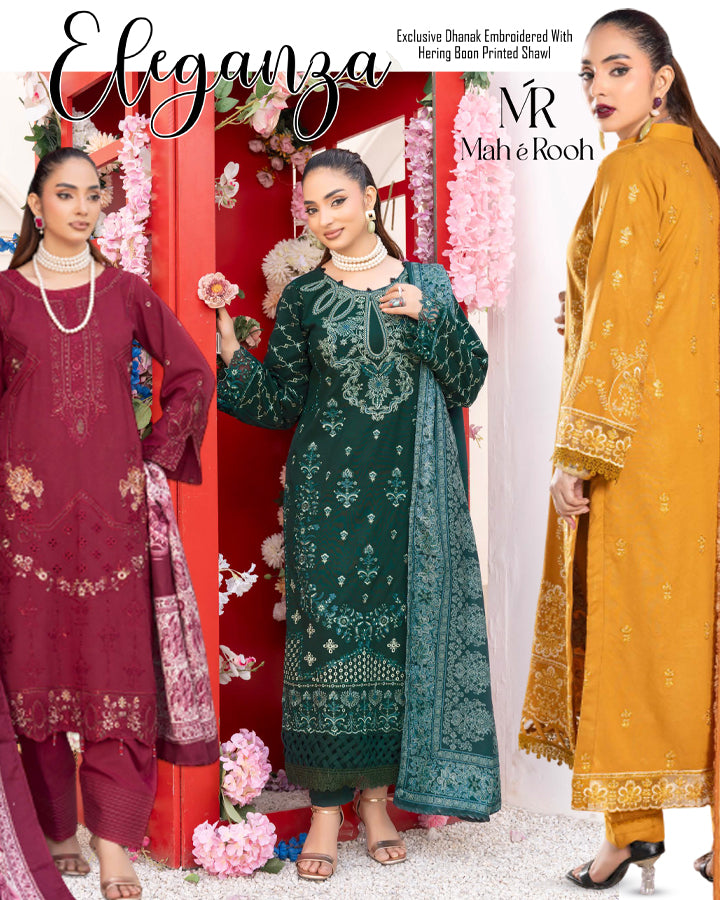 Fancy Embroidered Dhanak with Hering Boon Printed Shawl 3PC Unstitched - Eleganza