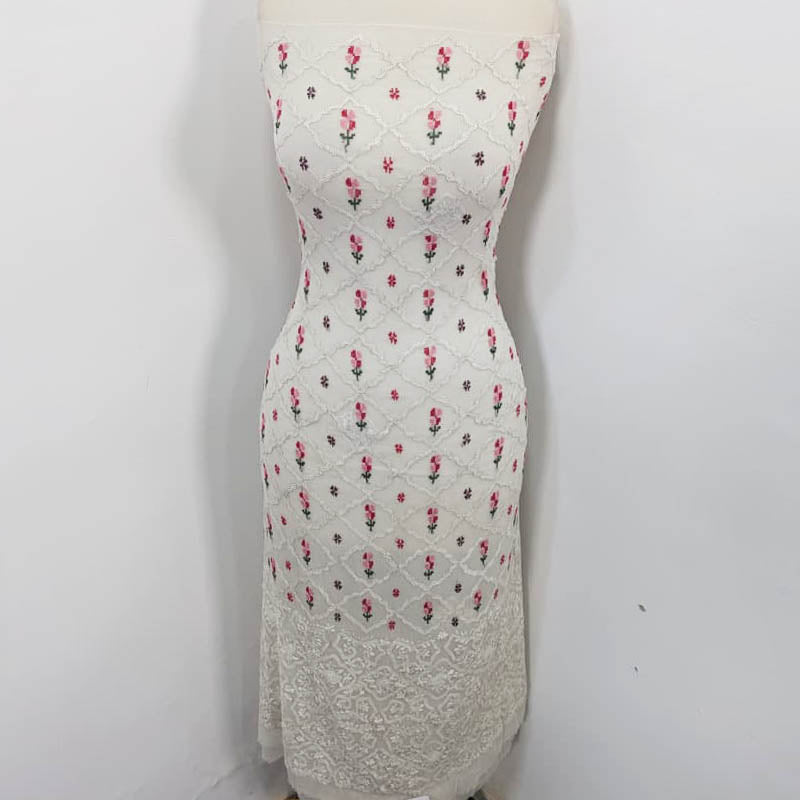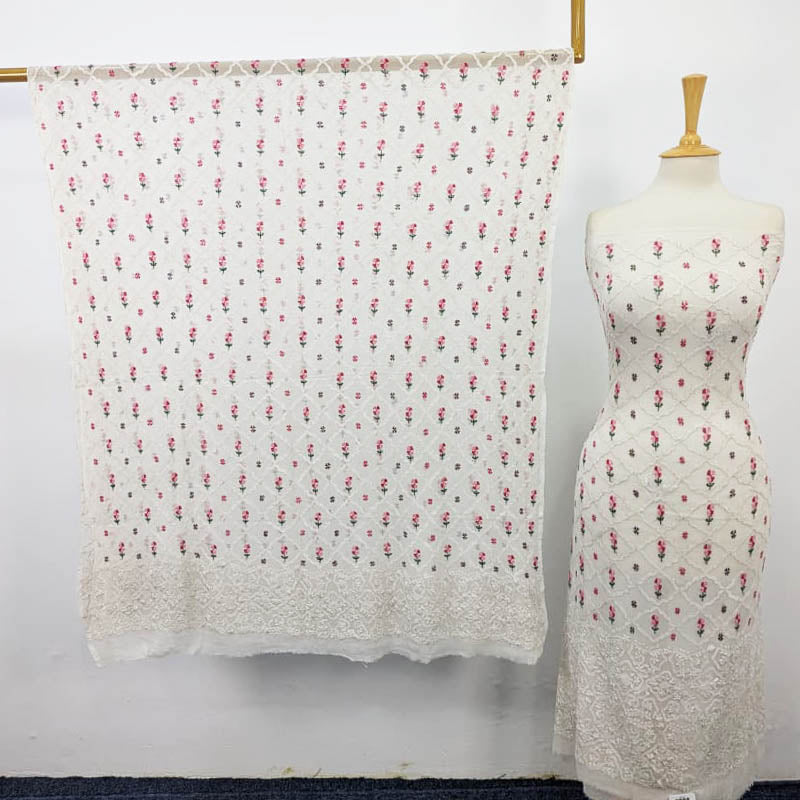 Premium Handmade Pure China Crinkle with Cross Stitch + Pakka Tanka Work Dyeable 2pc Unstitched Suit