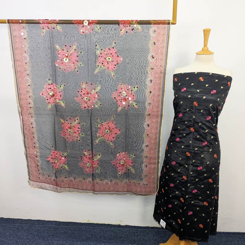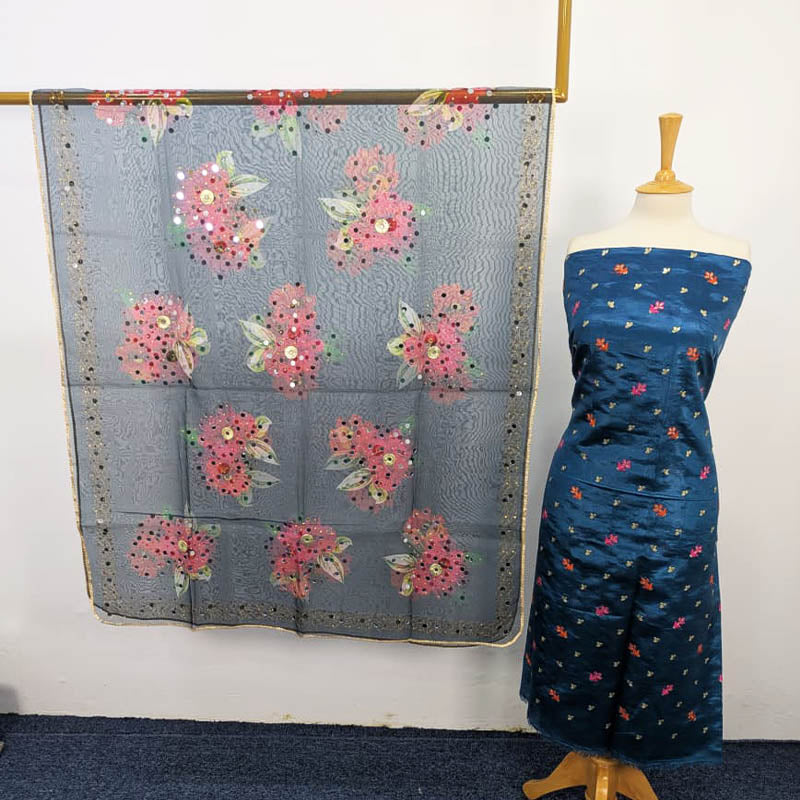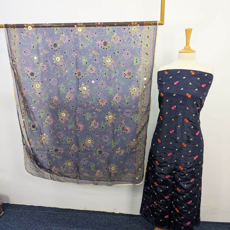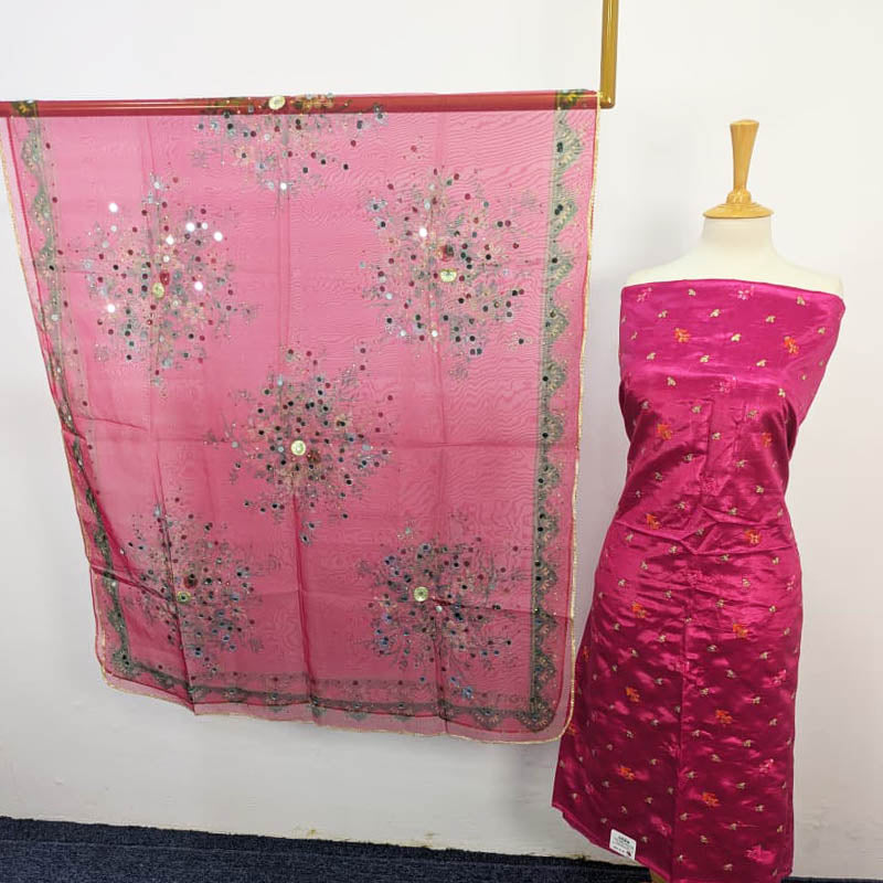 Fancy Katan Silk With Organza Print + Mirror Work Dupatta3PC Unstitched