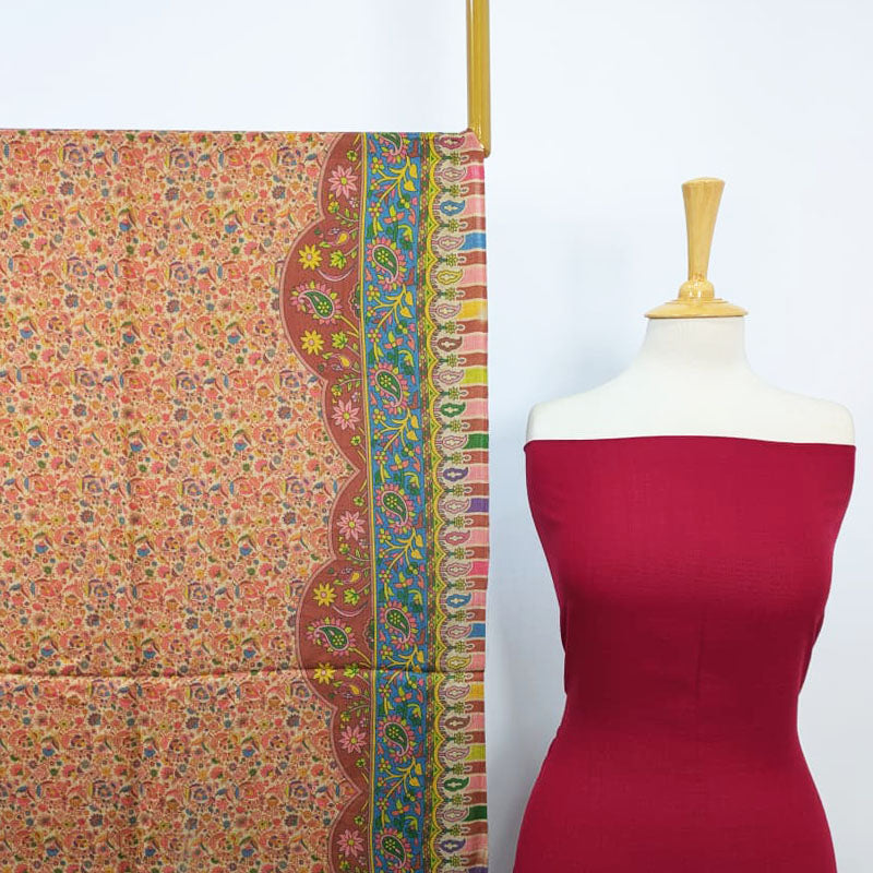 Premium Plain Pashmina with Qalamkar Print Shawl 3PC Unstitched Suit